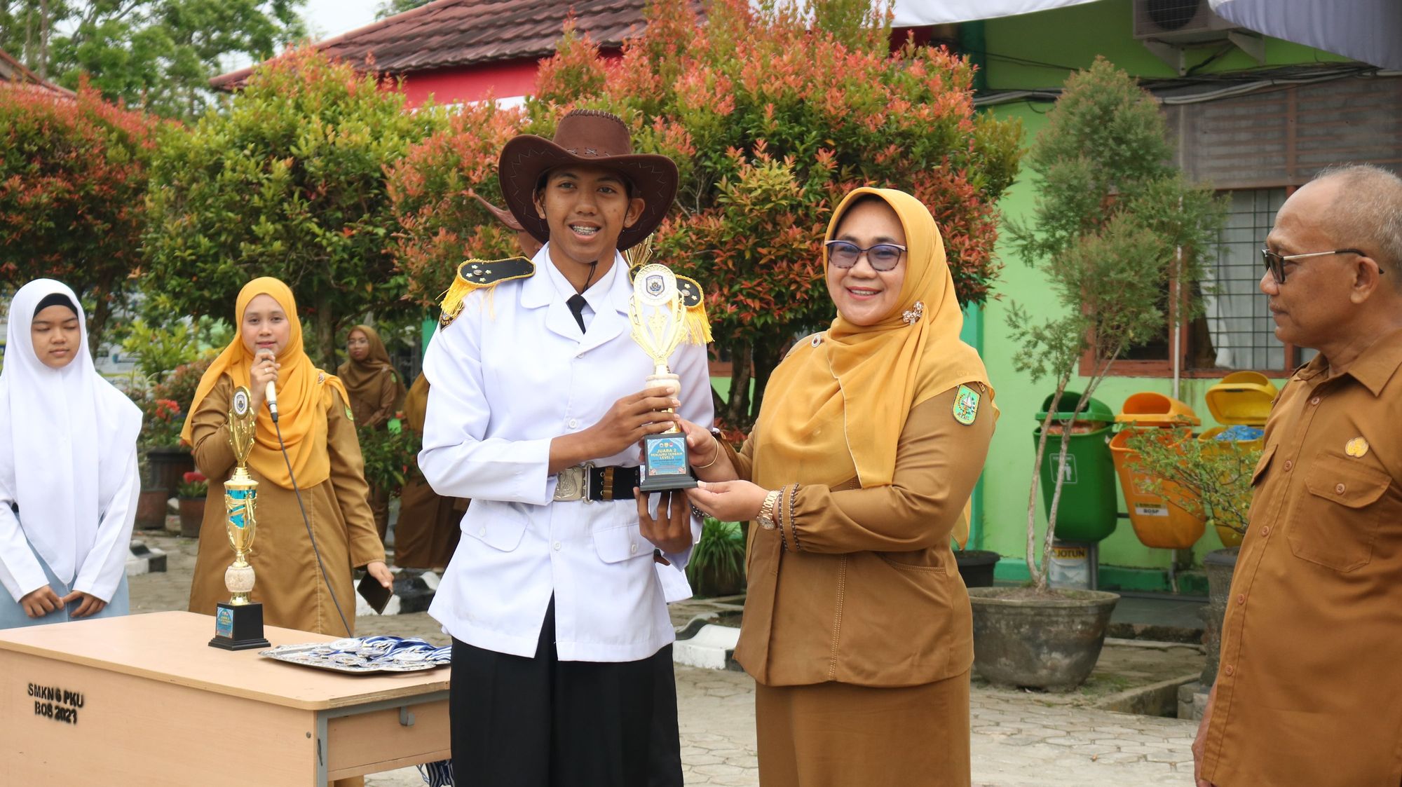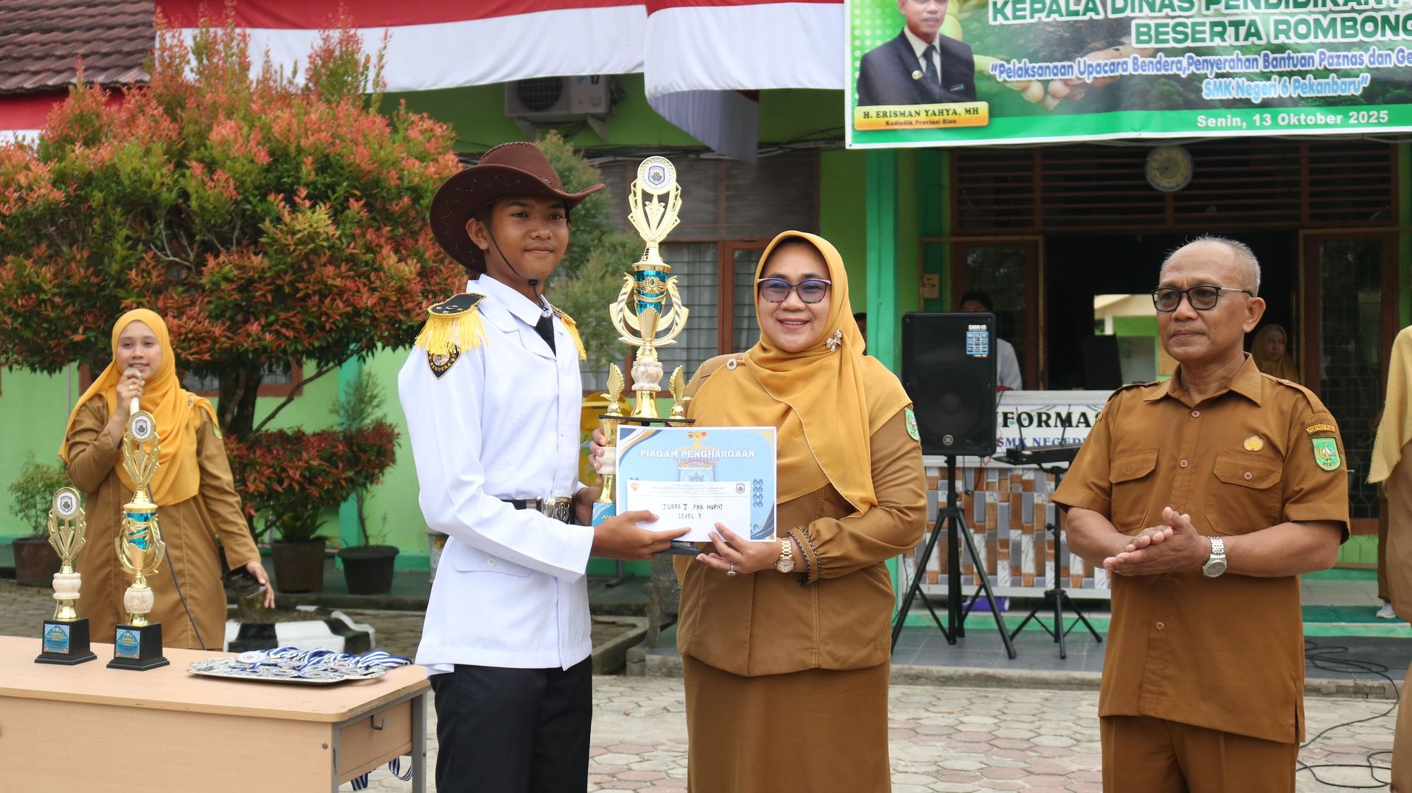 Sebagai bentuk apresiasi dan kebanggaan sekolah, pada apel pagi Senin, 27 Oktober 2025, dilakukan penyerahan piala secara resmi kepada Kepala Sekolah, Ibu Elva Susanti, S.Pd., M.M., di lapangan upacara SMK Negeri 6 Pekanbaru. Suasana apel dipenuhi rasa haru dan bangga saat piala diserahkan, disambut tepuk tangan seluruh peserta apel.