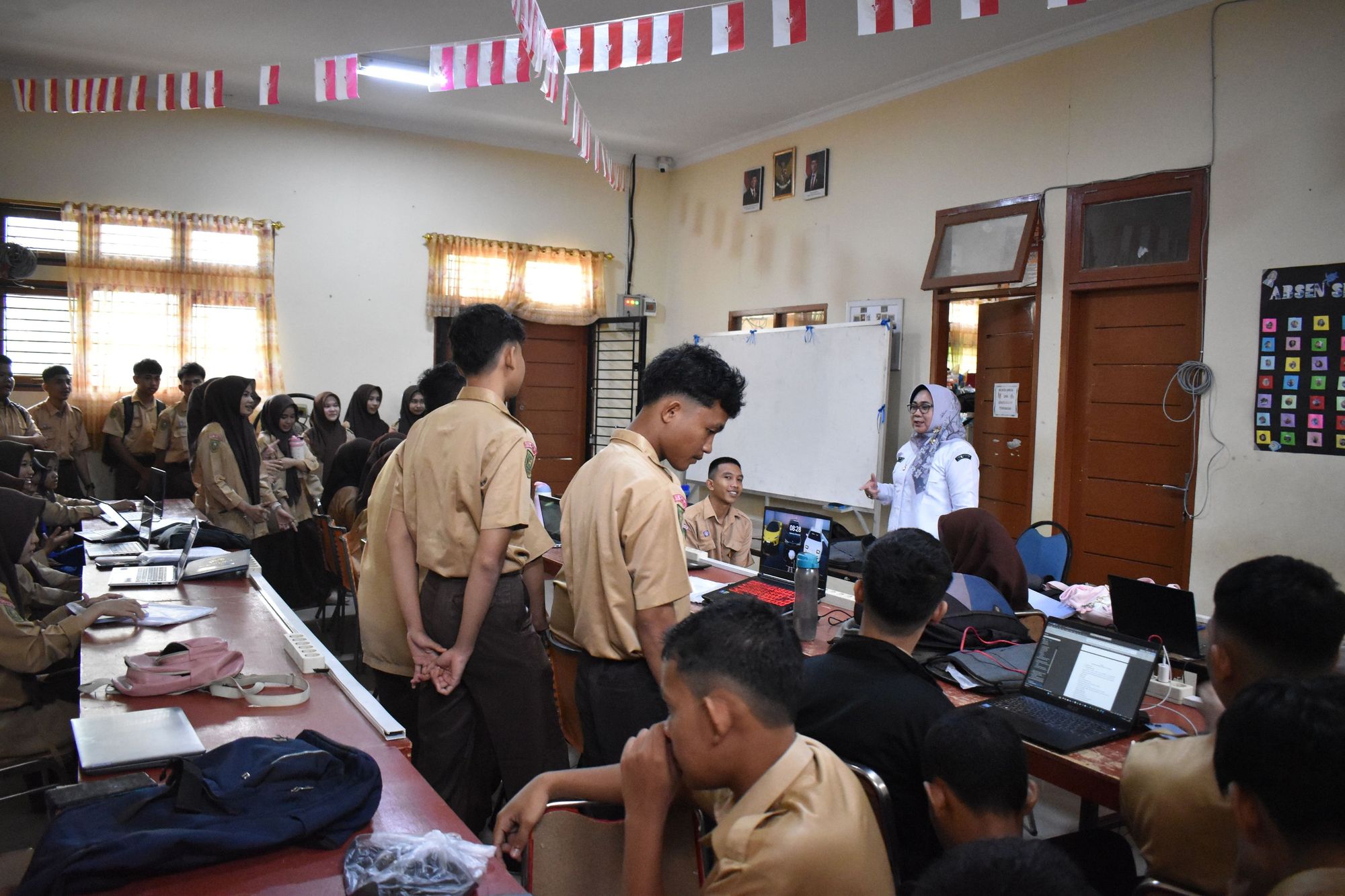 Selama pelaksanaan, siswa terlihat fokus mengerjakan soal melalui perangkat mereka, sementara guru berada di kelas untuk melakukan pemantauan langsung, memastikan seluruh proses berjalan tertib, lancar, dan sesuai prosedur. Dalam dokumentasi tampak guru mendampingi siswa, memastikan akses ujian berjalan baik serta memberi arahan jika terdapat kendala teknis.